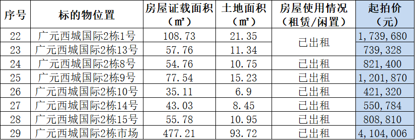 特别声明:1.标的物按实物现状拍卖。2.公告中的面积仅供参考,面积多少不影响其成交价。3.拍卖成交的,由委托方将标的交付(转移)给买受人。4. 拍卖成交后15个工作日内进入标的产权变更登记过户程序,由委托人提供过户的相关资料并负责办理标的产权过户手续;办理标的过户手续所产生一切税、费按国家相关规定买卖双方(委托人和买受人)各自承担相关部分,土地出让金(若有)由委托人承担。5.拍卖成交,标的产权登记过户手续完成前,标的所产生的一切费用、欠款由委托人承担。6.房屋承租人享有优先购买权。7.买受人从竞买成功并交清全部价款之日起享有房屋所有权;从交清全部拍卖成交款项的次月起享有租金收益权。8.标的物的状况由买受人自行查勘、核实。9.标的物现有及未知瑕疵,本公司不承担任何担保责任。10.本场拍卖会拍卖方式为有保留底价增价式拍卖,保留底价即为起拍价。