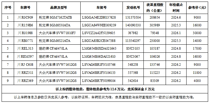 一、拍卖标的:别克、大众、猎豹等9辆旧机动车整体拍卖,参考价12.6万元,竞买保证金5万元。