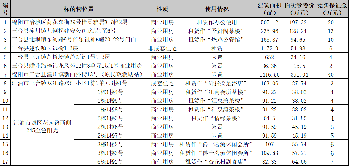 特别声明:1.标的物按实物现状拍卖。2.公告中的面积仅供参考,面积多少不影响其成交价。3.从委托人到买受人的权属变更登记过户的税款由委托人和买受人按国家规定各自承担应缴部分,从委托人到买受人的权属变更登记过户的办证工本费用由买受人承担。4.竞买成功,在买受人交清全部拍卖成交价款之前,标的物产生的各种费用由委托人承担;竞买成功,自买受人交清全部拍卖成交价款之日起,标的物产生的各种费用由买受人承担。5.房屋承租人享有优先购买权。6.买受人从竞买成功并交清全部价款之日起享有房屋所有权;从付清全部拍卖成交款项的次月起享有租金收益权。7.标的物的状况由买受人自行查勘、核实。8.拍卖成交并交清全部拍卖成交款项后,由竞买人自行对标的物进行清场接收;全额支付拍卖成交款项后由买受人自行办理产权变更登记,如未及时办理产权过户登记造成的法律后果由买受人自行承担。9.标的物现有及未知瑕疵,本公司不承担任何担保责任。10.本场拍卖会拍卖方式为有保留底价增价式拍卖,保留底价即为起拍价。