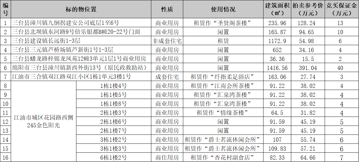 特别声明:1.标的物按实物现状拍卖。2.公告中的面积仅供参考,面积多少不影响其成交价。3.从委托人到买受人的权属变更登记过户的税款由委托人和买受人按国家规定各自承担应缴部分,从委托人到买受人的权属变更登记过户的办证工本费用由买受人承担。4.竞买成功,在买受人交清全部拍卖成交价款之前,标的物产生的各种费用由委托人承担;竞买成功,自买受人交清全部拍卖成交价款之日起,标的物产生的各种费用由买受人承担。5.房屋承租人享有优先购买权。6.买受人从竞买成功并交清全部价款之日起享有房屋所有权;从付清全部拍卖成交款项的次月起享有租金收益权。7.标的物的状况由买受人自行查勘、核实。8.拍卖成交并交清全部拍卖成交款项后,由竞买人自行对标的物进行清场接收;全额支付拍卖成交款项后由买受人自行办理产权变更登记,如未及时办理产权过户登记造成的法律后果由买受人自行承担。9.标的物现有及未知瑕疵,本公司不承担任何担保责任。10.本场拍卖会拍卖方式为有保留底价增价式拍卖,保留底价即为起拍价。