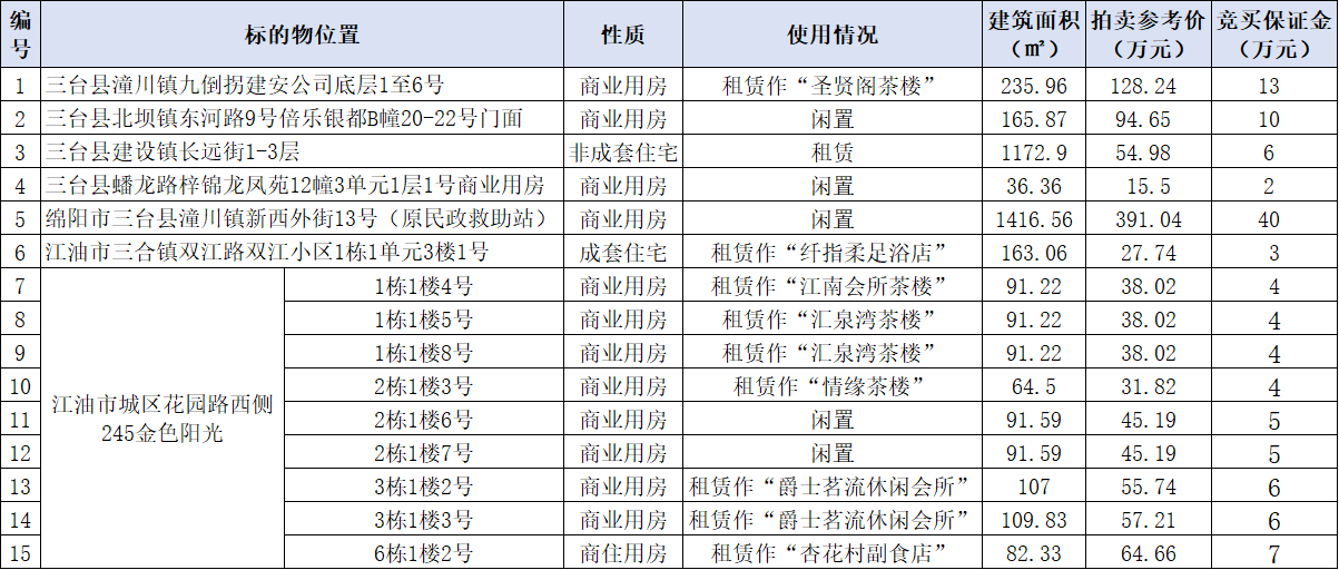特别声明:1.标的物按实物现状拍卖。2.公告中的面积仅供参考,面积多少不影响其成交价。3.从委托人到买受人的权属变更登记过户的税款由委托人和买受人按国家规定各自承担应缴部分,从委托人到买受人的权属变更登记过户的办证工本费用由买受人承担。4.竞买成功,在买受人交清全部拍卖成交价款之前,标的物产生的各种费用由委托人承担;竞买成功,自买受人交清全部拍卖成交价款之日起,标的物产生的各种费用由买受人承担。5.房屋承租人享有优先购买权。6.买受人从竞买成功并交清全部价款之日起享有房屋所有权;从付清全部拍卖成交款项的次月起享有租金收益权。7.标的物的状况由买受人自行查勘、核实。8.拍卖成交并交清全部拍卖成交款项后,由竞买人自行对标的物进行清场接收;全额支付拍卖成交款项后由买受人自行办理产权变更登记,如未及时办理产权过户登记造成的法律后果由买受人自行承担。9.标的物现有及未知瑕疵,本公司不承担任何担保责任。10.本场拍卖会拍卖方式为有保留底价增价式拍卖,保留底价即为起拍价。