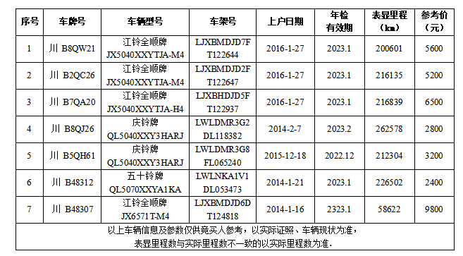 一、拍卖标的:江铃全顺、庆铃、五十铃等7辆旧机动车,拍卖参考价:2800-9800元,保证金5000元/辆。