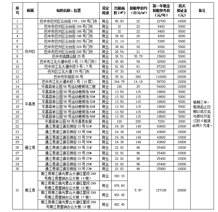 巴中烟草巴州区、平昌县、通江县、南江县出租资产三年期租赁权