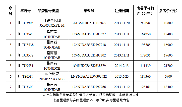 一、拍卖标的:江铃全顺、指南者、依维柯等7辆旧机动车,拍卖参考价:6700-21700元,保证金1万元/辆。