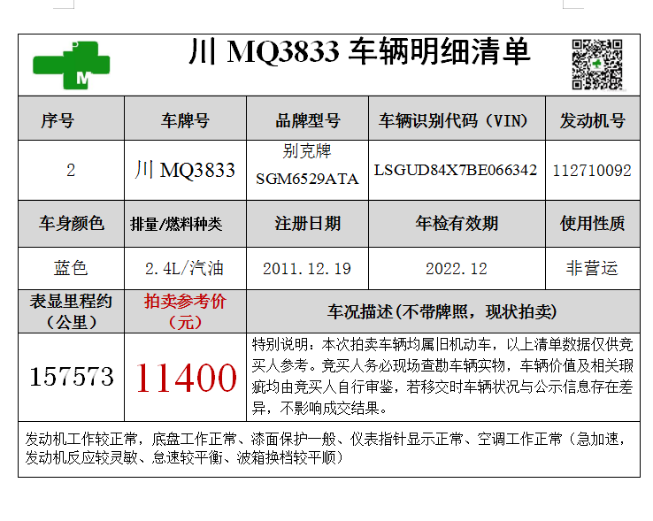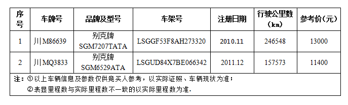 别克牌两辆旧机动车,参考价1.14-1.3万元,竞买保证金1万元/辆。