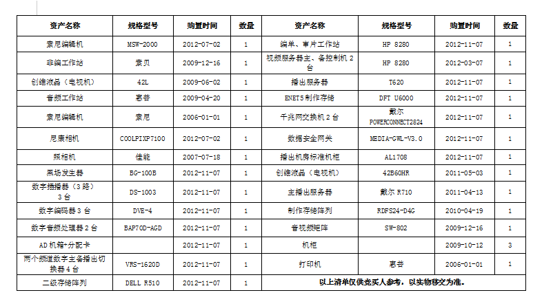一、拍卖标的:电脑、液晶电视机、照相机、编辑机、系统软件等一批废旧设施设备,拍卖参考价5000元,保证金2000元。