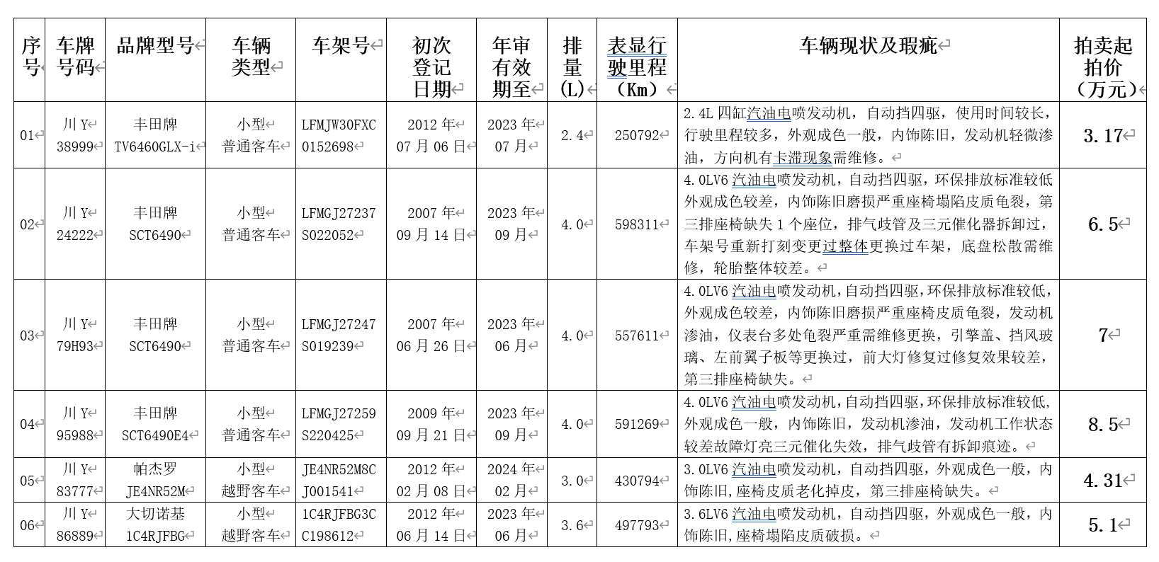 特别声明:1、本次拍卖的车辆是以现状进行拍卖,是指车辆在展示期间竞买人查验时车辆的车牌、型号、新旧、颜色、内装、配置、性能、使用时间、使用状况、有无损伤等现状情况,竞买人必须自行前往车辆展示地现场查看车辆状况,自行评估车辆现状价值,并承担相应的风险,向竞买人提供的车辆相关资料(《鉴定评估作业表》、《鉴定评估报告书》)仅供参考,委托人和拍卖人不承担瑕疵担保责任。由竞买人自行到国家车辆管理部门咨询和调查二手车过户、转户的相关政策规定(特别是异地购买车辆过户政策规定)。如因竞买人对二手车过户、转户的相关政策规定不知晓而造成的车辆不能过户,买受人承担相应的责任和费用,成交价款、拍卖佣金和过户保证金不予退回。竞买人自行评估车辆价值,并承担相应的风险。