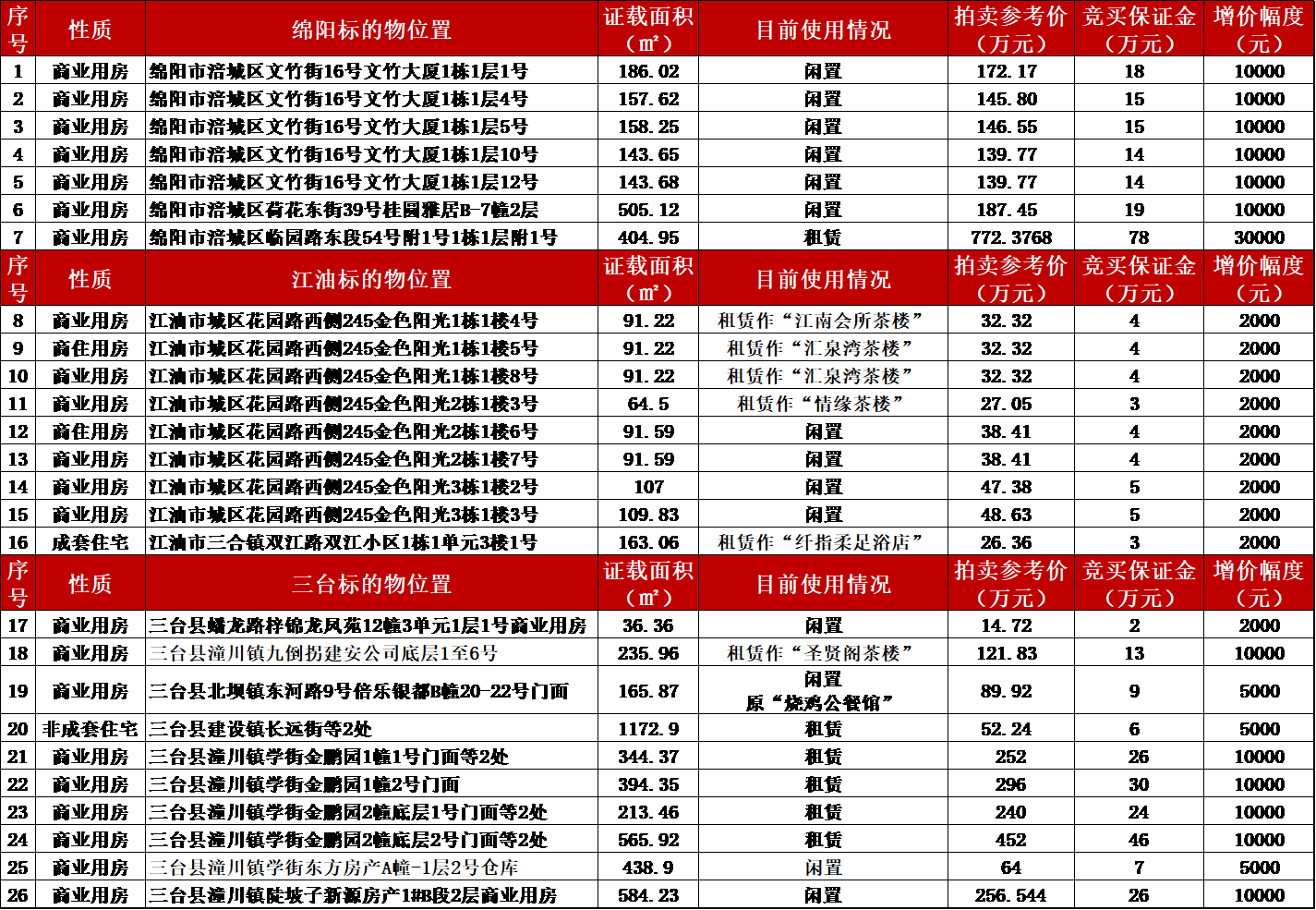 特别声明:1.标的物按实物现状拍卖。2.公告中的面积仅供参考,面积多少不影响其成交价。3.从原债务人到委托人的权属变更登记过户的税费由委托人承担;委托人到买受人的权属变更登记过户的税款由委托人和买受人按国家规定各自承担应缴部分,从委托人到买受人的权属变更登记过户的办证工本费用由买受人承担;办理标的权属变更登记过户须缴纳的土地出让金(若有)由买受人承担,出让金金额由政府相关职能部门核定。4.竞买成功,在买受人交清全部拍卖成交价款之前,标的物产生的各种费用由委托人承担;竞买成功,自买受人交清全部拍卖成交价款之日起,标的物产生的各种费用由买受人承担。5.房屋承租人享有优先购买权。6.买受人从竞买成功并交清全部价款之日起享有房屋所有权;从付清全部拍卖成交款项的次月起享有租金收益权。7.标的物的状况由买受人自行查勘、核实。8.拍卖成交并交清全部拍卖成交款项后,由买受人自行对标的物进行清场接收;全额支付拍卖成交款项后由买受人自行办理产权变更登记,委托人配合办理,如未及时办理产权过户登记造成的法律后果由买受人自行承担。9.标的物现有及未知瑕疵,本公司不承担任何担保责任。10.本场拍卖会拍卖方式为有保留底价增价式拍卖,保留底价即为起拍价。