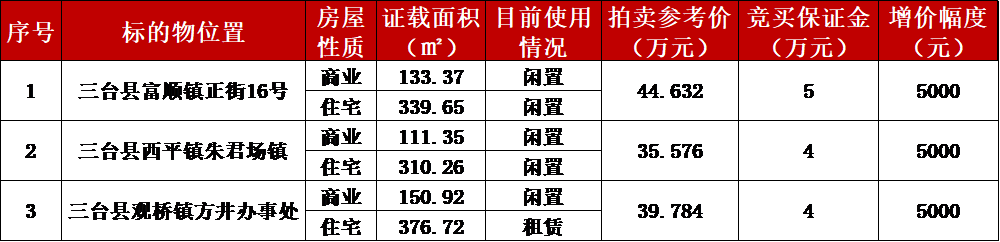 特别声明:1.标的物按实物现状拍卖。2.公告中的面积仅供参考,面积多少不影响其成交价。3.从委托人到买受人的权属变更登记过户的税款由委托人和买受人按国家规定各自承担应缴部分,从委托人到买受人的权属变更登记过户的办证工本费用由买受人承担。4.竞买成功,在买受人交清全部拍卖成交价款之前,标的物产生的各种费用由委托人承担;竞买成功,自买受人交清全部拍卖成交价款之日起,标的物产生的各种费用由买受人承担。5.买受人从竞买成功并交清全部价款之日起享有房屋所有权。6.标的物的状况由买受人自行查勘、核实。7.拍卖成交并交清全部拍卖成交款项后,由买受人自行对标的物进行清场接收;全额支付拍卖成交款项后由买受人自行办理产权变更登记,委托人配合办理,如未及时办理产权过户登记造成的法律后果由买受人自行承担。8.标的物现有及未知瑕疵,本公司不承担任何担保责任。9.本场拍卖会拍卖方式为有保留底价增价式拍卖,保留底价即为起拍价。