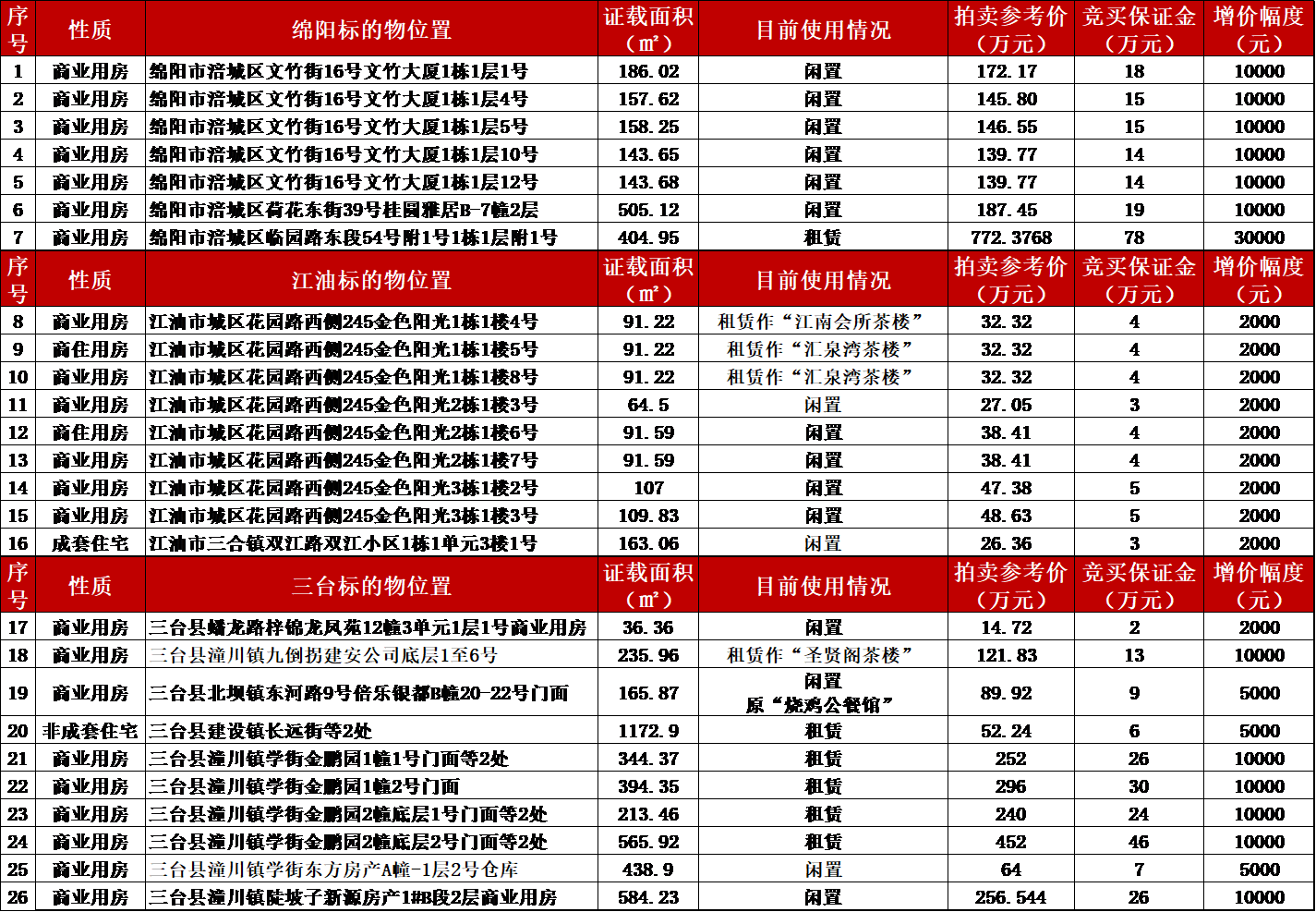 特别声明:1.标的物按实物现状拍卖。2.公告中的面积仅供参考,面积多少不影响其成交价。3.从原债务人到委托人的权属变更登记过户的税费由委托人承担;委托人到买受人的权属变更登记过户的税款由委托人和买受人按国家规定各自承担应缴部分,从委托人到买受人的权属变更登记过户的办证工本费用由买受人承担;办理标的权属变更登记过户须缴纳的土地出让金(若有)由买受人承担,出让金金额和出让年限由政府相关职能部门核定。4.竞买成功,在买受人交清全部拍卖成交价款之前,标的物产生的各种费用由委托人承担;竞买成功,自买受人交清全部拍卖成交价款之日起,标的物产生的各种费用由买受人承担。5.房屋承租人享有优先购买权。6.买受人从竞买成功并交清全部价款之日起享有房屋所有权;从付清全部拍卖成交款项的次月起享有租金收益权。7.标的物的状况由买受人自行查勘、核实。8.拍卖成交并交清全部拍卖成交款项后,由买受人自行对标的物进行清场接收;全额支付拍卖成交款项后由买受人自行办理产权变更登记,委托人配合办理,如未及时办理产权过户登记造成的法律后果由买受人自行承担。9.标的物现有及未知瑕疵,本公司不承担任何担保责任。10.本场拍卖会拍卖方式为有保留底价增价式拍卖,保留底价即为起拍价。