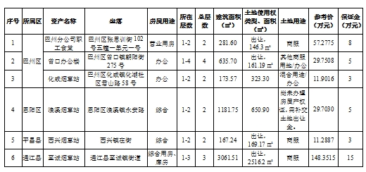 巴中烟草公司巴州分公司职工食堂、曾口办公楼、化成烟草站,恩阳区渔溪烟草站,平昌县西兴烟草站,通江县至诚烟草站六处出售房产,参考价11.2887万元至148.3515万元,保证金3万元至15万元。