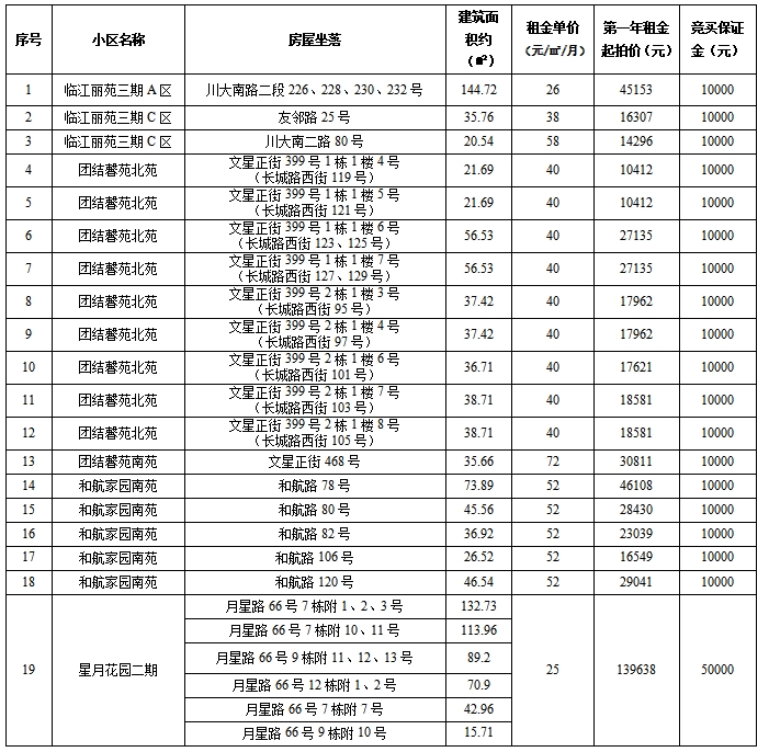 成都市双流区临江丽苑三期A/C区、团结馨苑南/北苑、和航家园南苑、星月花园二期配套商铺三年期租赁权,竞买保证金:1-5万元。